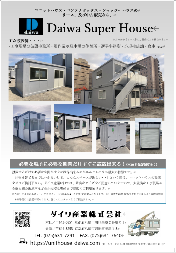 ダイワ産業株式会社は、京都府八幡市でユニットハウスをリース・中古販売している会社です。